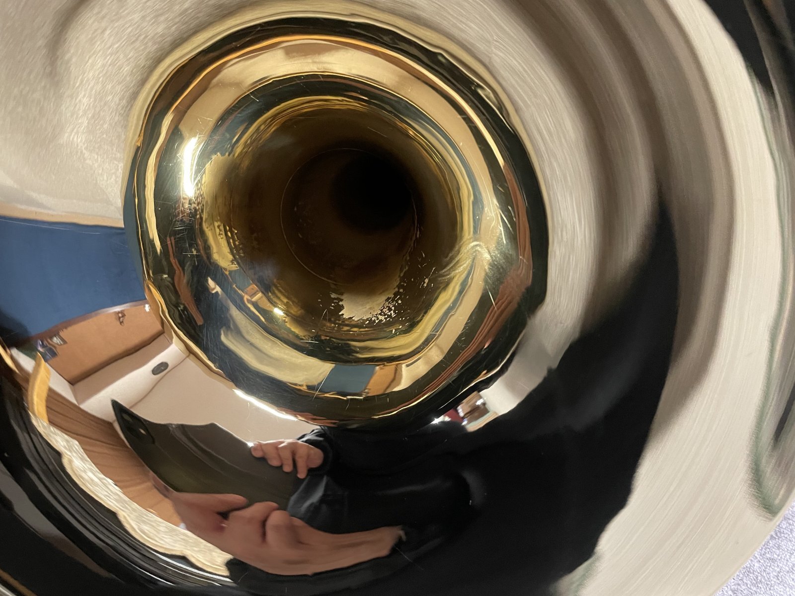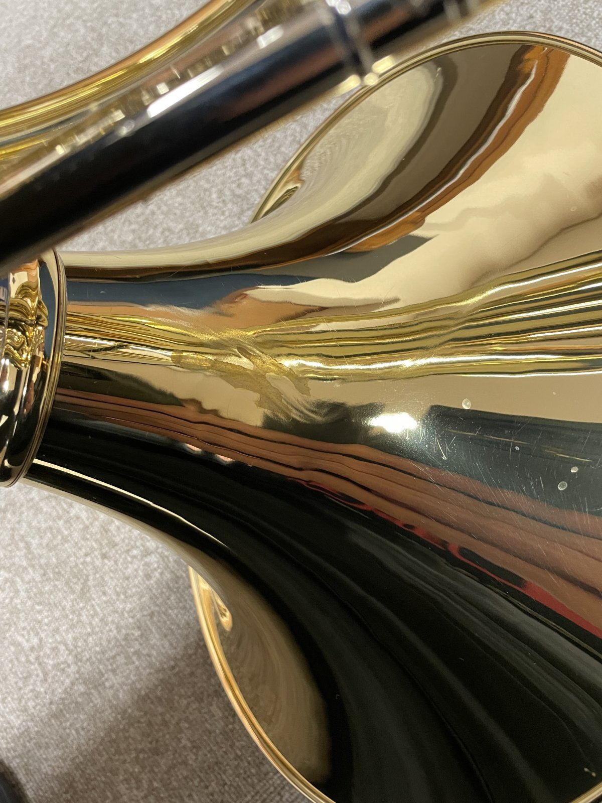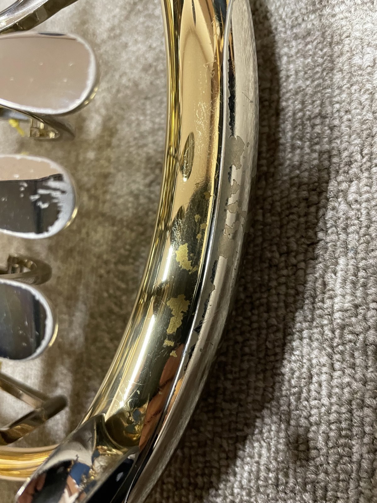 本個体は、ベルフレア部分に大きな歪みを修理した跡が確認できます。また、全体各所に小傷や狭い範囲のラッカー剥げ、小さめの凹みの修理痕が散見されるなど、外観には相応の使用感がございます。しかしながら、これらは演奏性能に影響するものではなく、実用性を重視される方にはむしろ魅力的な価格帯で手に入る好機とも言えます。